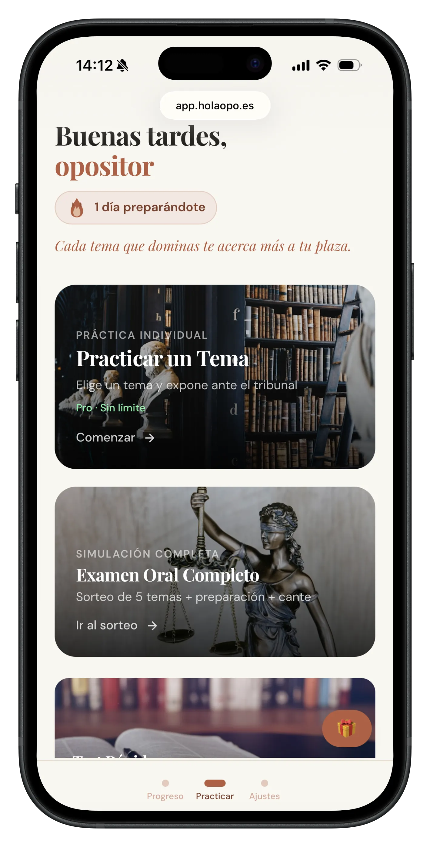 El oral se gana con práctica diaria, hablando en voz alta, bajo presión. Eso es justo lo que hacemos: simular el tribunal de la oposición de acceso a la Carrera Judicial y Fiscal para que sigas practicando cuando tu preparador no está.
